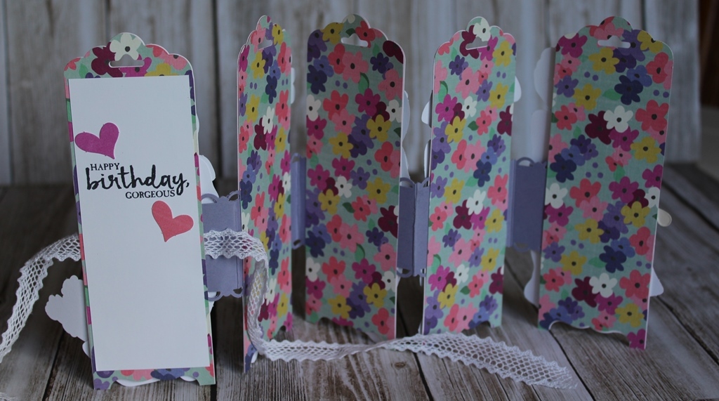 When I saw these adorable little girl cut outs in the kit I thought they deserved to have their own little wardrobe, so I have made a row of them connected together to make a card which I am sure any young girl would just love! I then made a gift bag to hold the card to keep it safe for giving.