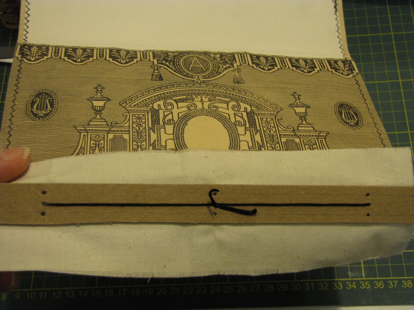 I found some calico, cut it the length of the second piece of board and about 3 times the width, and stuck the board in the centre of the calico. I wanted to use a three-hole pamphlet stitch to sew my signatures in and knew I wanted to sew three signatures in to this journal (I was counting the envelope as one), therefore I would put the middle signature in the middle of the board. I proceeded to measure evenly spaced lines and put dots in the centre of these and about 2.5 cm away from either end - this would be where I would poke holes for my signatures to be sewn in. Please refer to my video below for more detailed instructions.